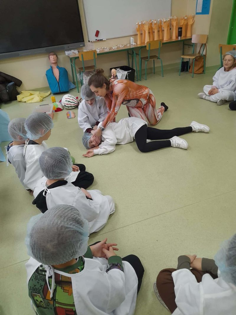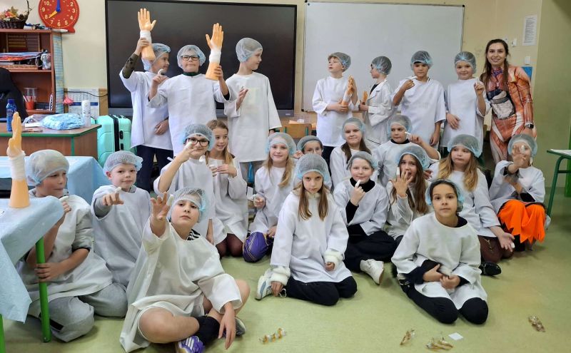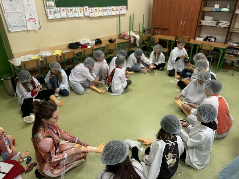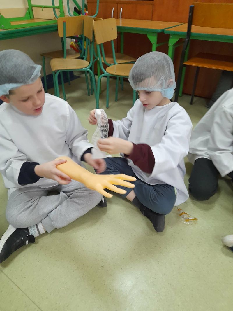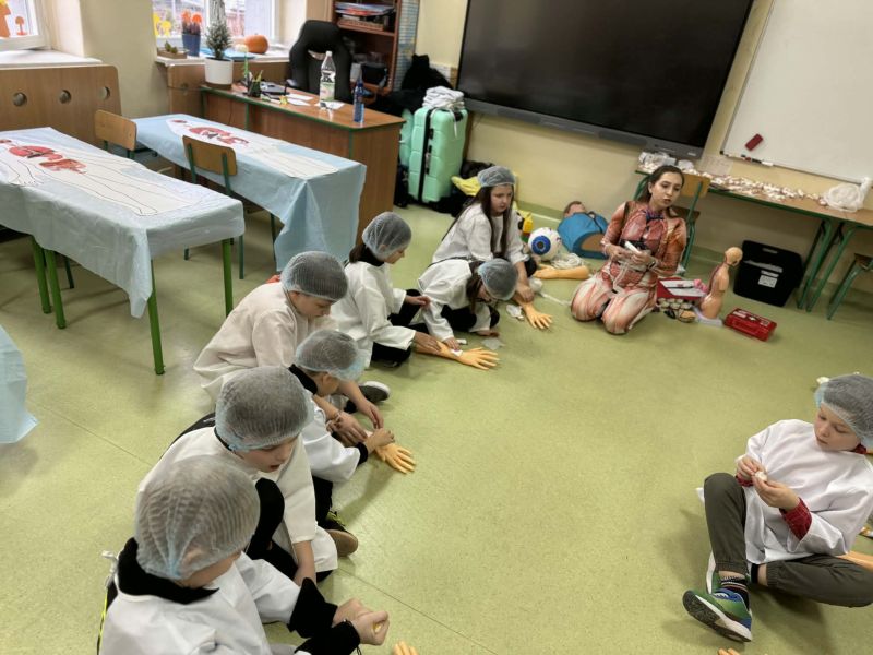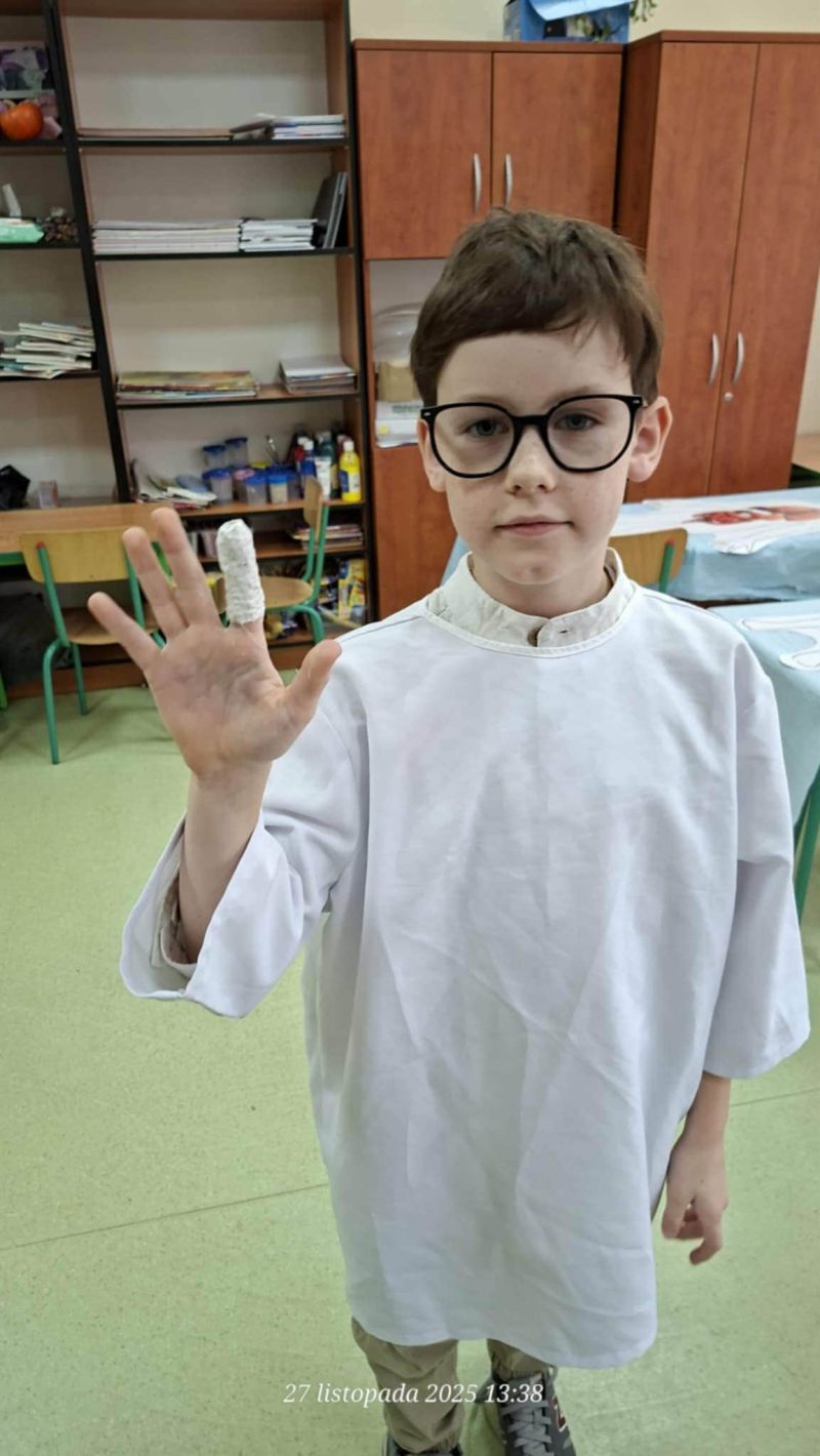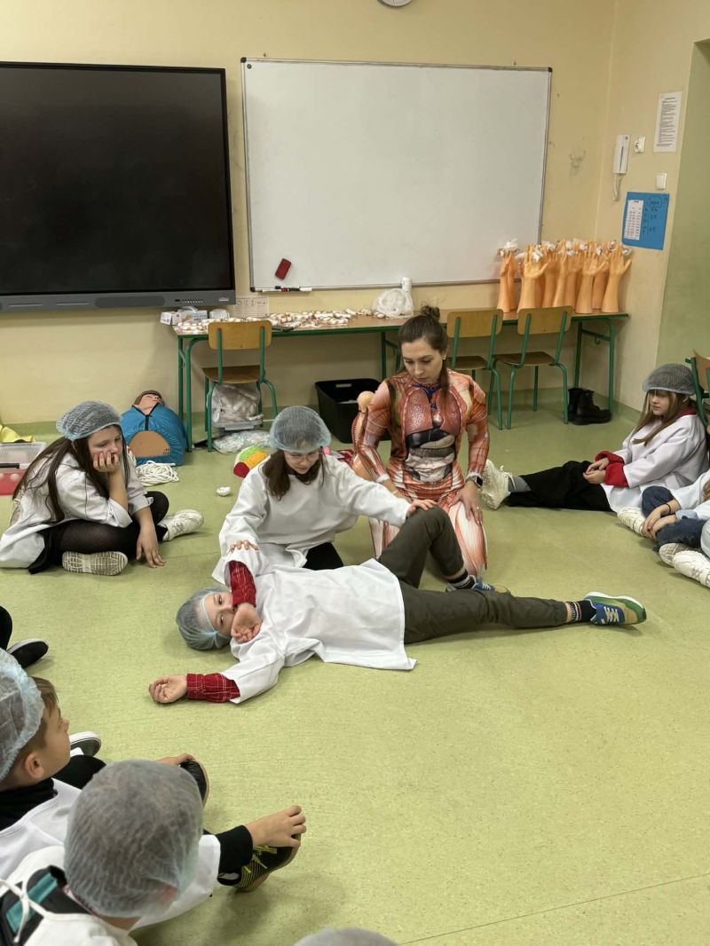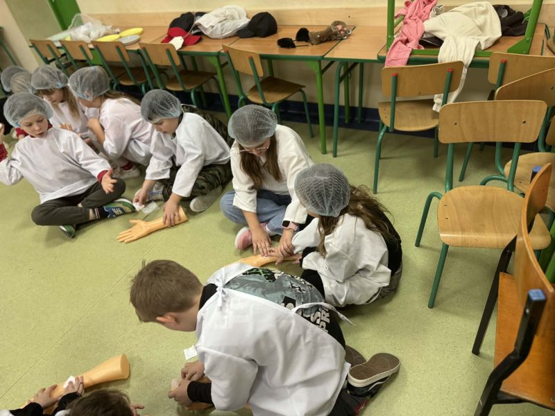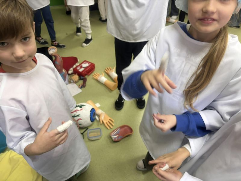 Dnia 27 listopada odbyły się warsztaty medyczne, podczas których dzieci miały okazję poznać podstawy anatomii i pracy medyka. Uczestnicy dowiedzieli się, jak wygląda budowa ludzkiego ciała oraz za co odpowiada mózg. Podczas zajęć praktycznych dzieci wykonywały proste „operacje” na modelach, dzięki czemu mogły poczuć się jak prawdziwi chirurdzy. W kolejnej części warsztatów uczestnicy uczyli się udzielania pierwszej pomocy – poznali zasady postępowania w nagłych wypadkach i ćwiczyli, jak prawidłowo opatrywać rany. Zwieńczeniem zajęć była zabawa w zakładanie gipsu: każde dziecko mogło założyć gips na palec i zobaczyć, jak wygląda ten proces w praktyce. Warsztaty przebiegły w atmosferze ciekawości, nauki i dobrej zabawy. Dzieci zdobyły nową wiedzę oraz praktyczne umiejętności, które mogą okazać się bardzo przydatne na co dzień.