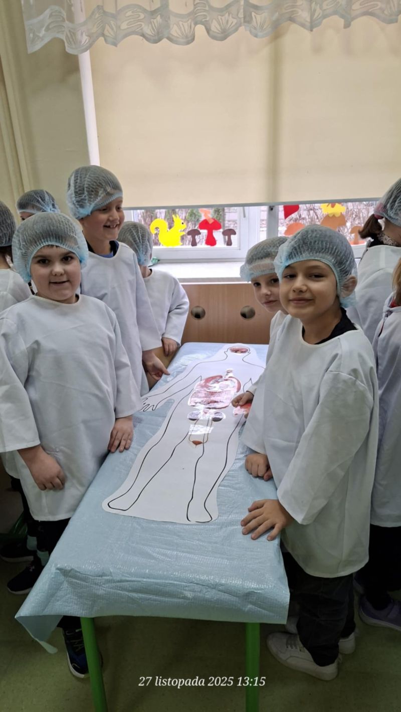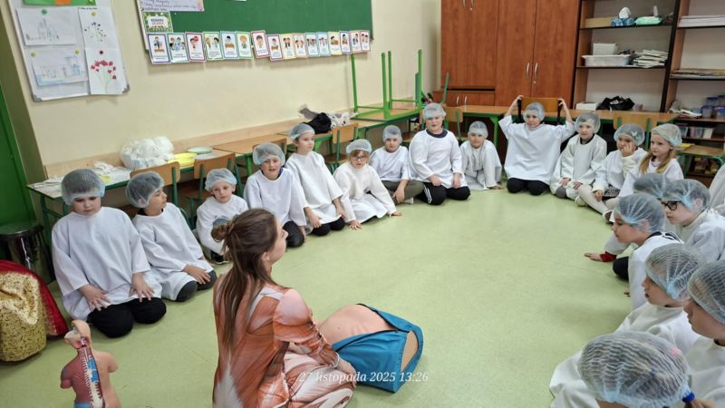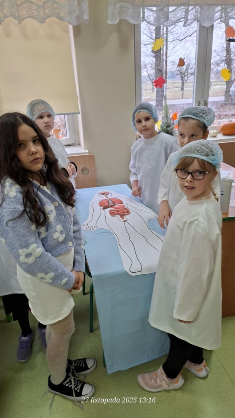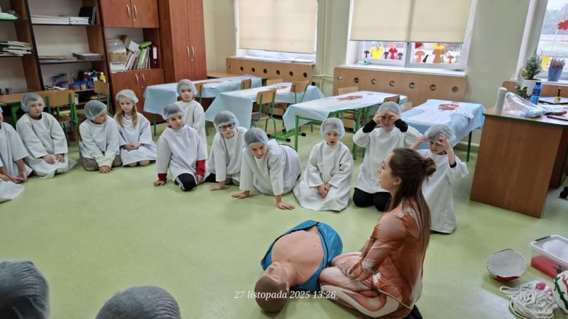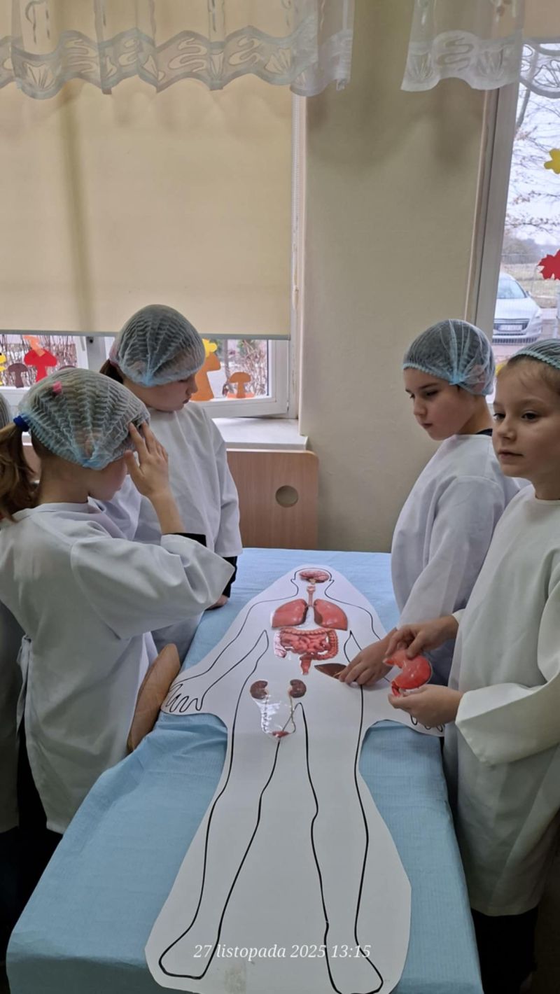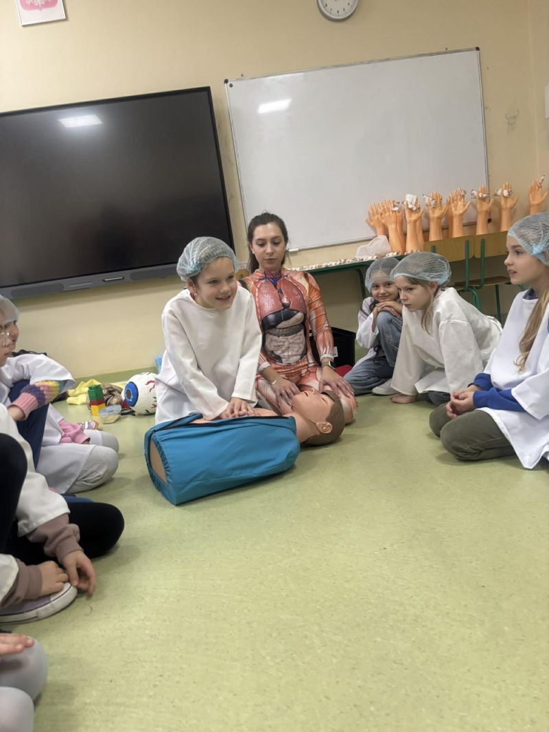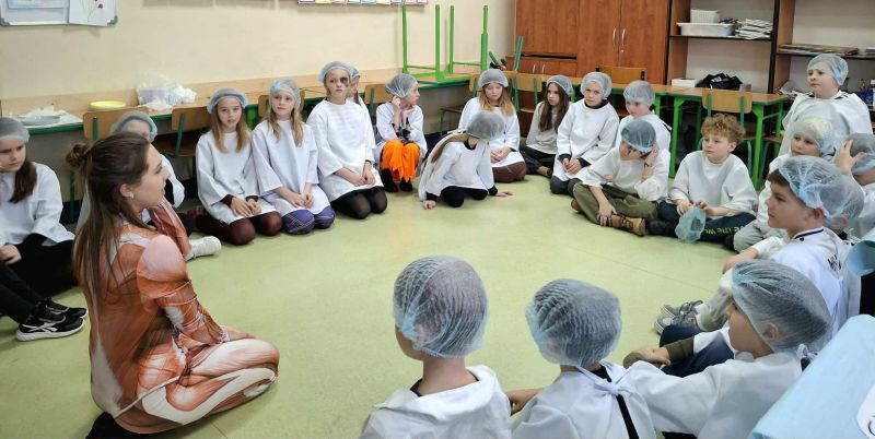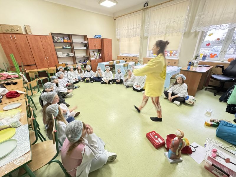 Dnia 27 listopada odbyły się warsztaty medyczne, podczas których dzieci miały okazję poznać podstawy anatomii i pracy medyka. Uczestnicy dowiedzieli się, jak wygląda budowa ludzkiego ciała oraz za co odpowiada mózg. Podczas zajęć praktycznych dzieci wykonywały proste „operacje” na modelach, dzięki czemu mogły poczuć się jak prawdziwi chirurdzy. W kolejnej części warsztatów uczestnicy uczyli się udzielania pierwszej pomocy – poznali zasady postępowania w nagłych wypadkach i ćwiczyli, jak prawidłowo opatrywać rany. Zwieńczeniem zajęć była zabawa w zakładanie gipsu: każde dziecko mogło założyć gips na palec i zobaczyć, jak wygląda ten proces w praktyce. Warsztaty przebiegły w atmosferze ciekawości, nauki i dobrej zabawy. Dzieci zdobyły nową wiedzę oraz praktyczne umiejętności, które mogą okazać się bardzo przydatne na co dzień.
