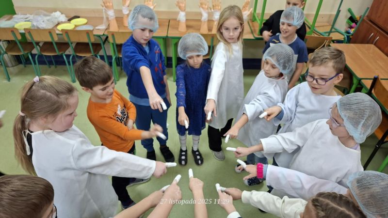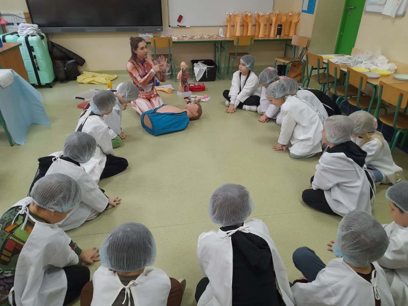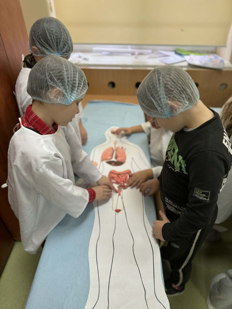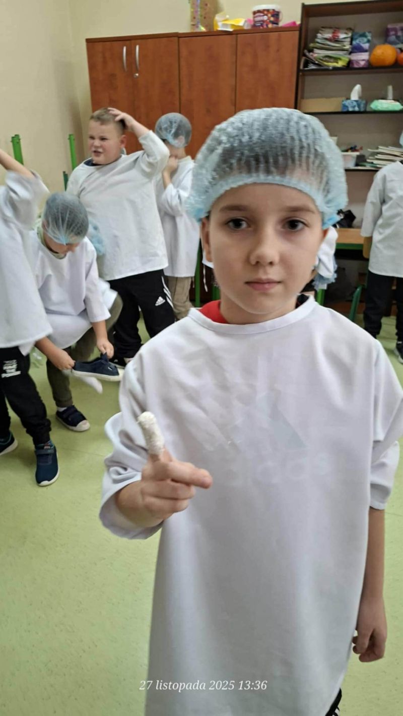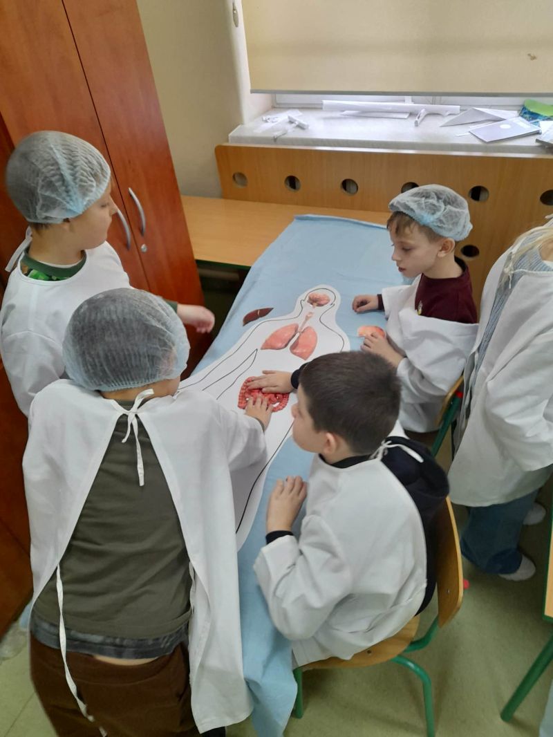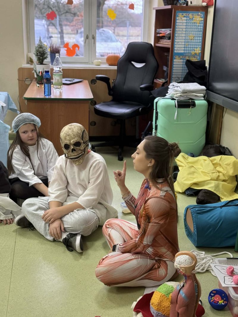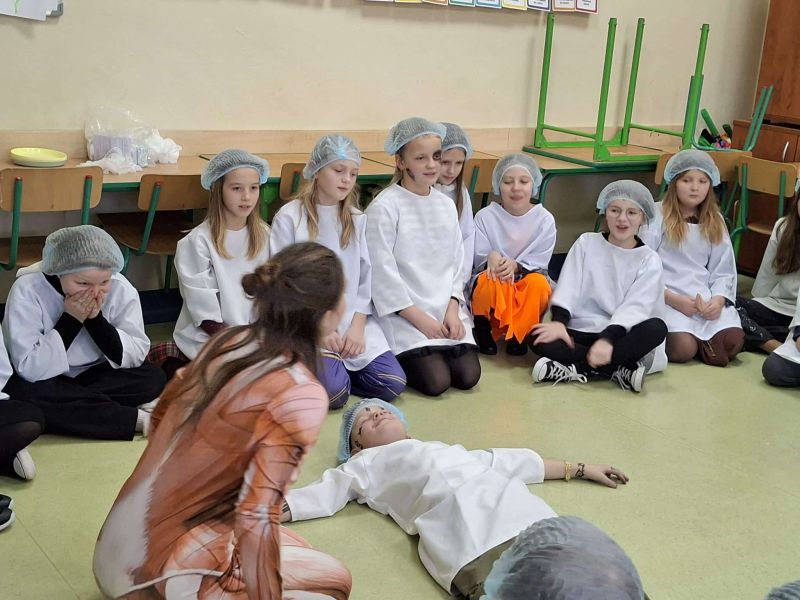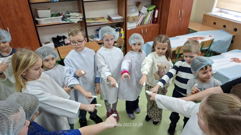 Dnia 27 listopada odbyły się warsztaty medyczne, podczas których dzieci miały okazję poznać podstawy anatomii i pracy medyka. Uczestnicy dowiedzieli się, jak wygląda budowa ludzkiego ciała oraz za co odpowiada mózg. Podczas zajęć praktycznych dzieci wykonywały proste „operacje” na modelach, dzięki czemu mogły poczuć się jak prawdziwi chirurdzy. W kolejnej części warsztatów uczestnicy uczyli się udzielania pierwszej pomocy – poznali zasady postępowania w nagłych wypadkach i ćwiczyli, jak prawidłowo opatrywać rany. Zwieńczeniem zajęć była zabawa w zakładanie gipsu: każde dziecko mogło założyć gips na palec i zobaczyć, jak wygląda ten proces w praktyce. Warsztaty przebiegły w atmosferze ciekawości, nauki i dobrej zabawy. Dzieci zdobyły nową wiedzę oraz praktyczne umiejętności, które mogą okazać się bardzo przydatne na co dzień.