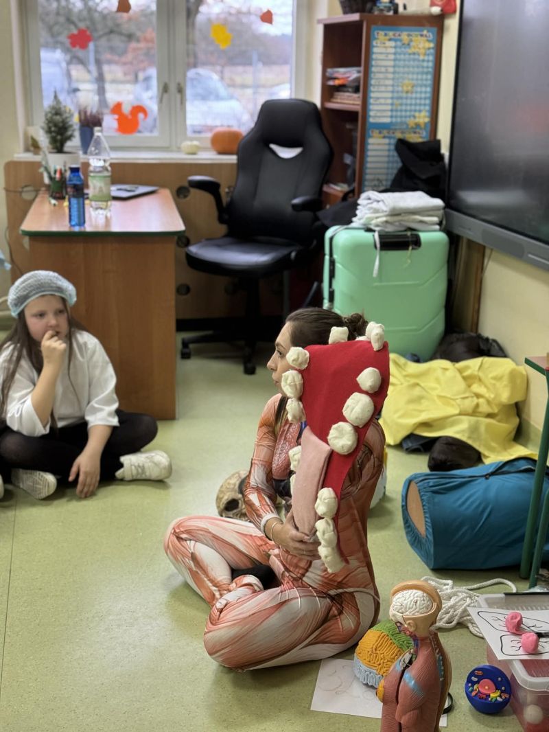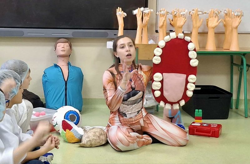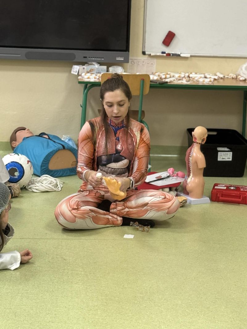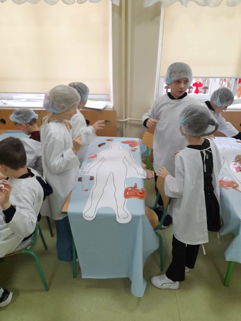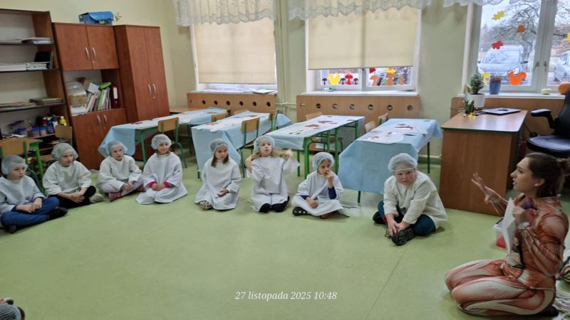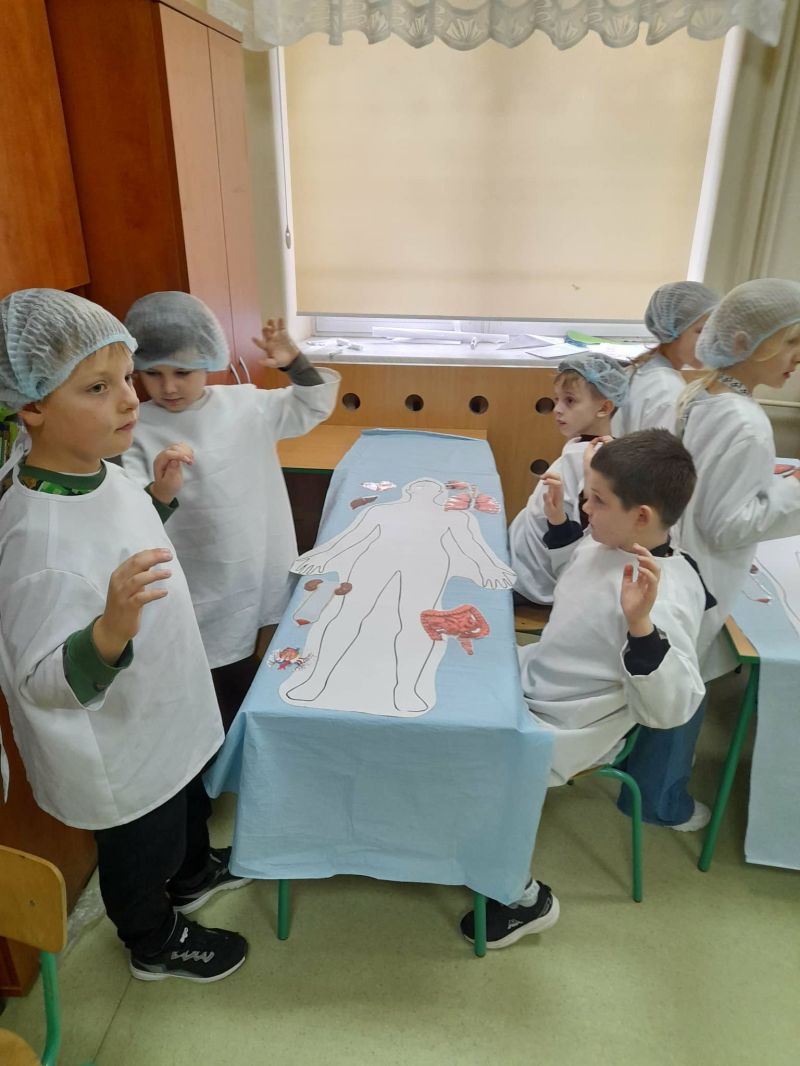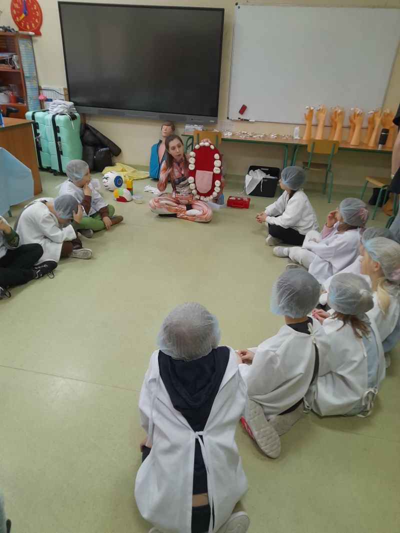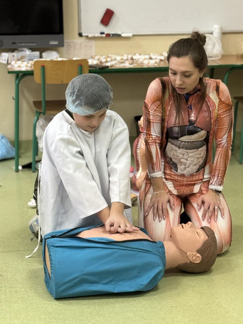 Dnia 27 listopada odbyły się warsztaty medyczne, podczas których dzieci miały okazję poznać podstawy anatomii i pracy medyka. Uczestnicy dowiedzieli się, jak wygląda budowa ludzkiego ciała oraz za co odpowiada mózg. Podczas zajęć praktycznych dzieci wykonywały proste „operacje” na modelach, dzięki czemu mogły poczuć się jak prawdziwi chirurdzy. W kolejnej części warsztatów uczestnicy uczyli się udzielania pierwszej pomocy – poznali zasady postępowania w nagłych wypadkach i ćwiczyli, jak prawidłowo opatrywać rany. Zwieńczeniem zajęć była zabawa w zakładanie gipsu: każde dziecko mogło założyć gips na palec i zobaczyć, jak wygląda ten proces w praktyce. Warsztaty przebiegły w atmosferze ciekawości, nauki i dobrej zabawy. Dzieci zdobyły nową wiedzę oraz praktyczne umiejętności, które mogą okazać się bardzo przydatne na co dzień.